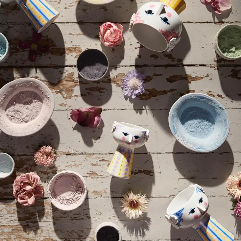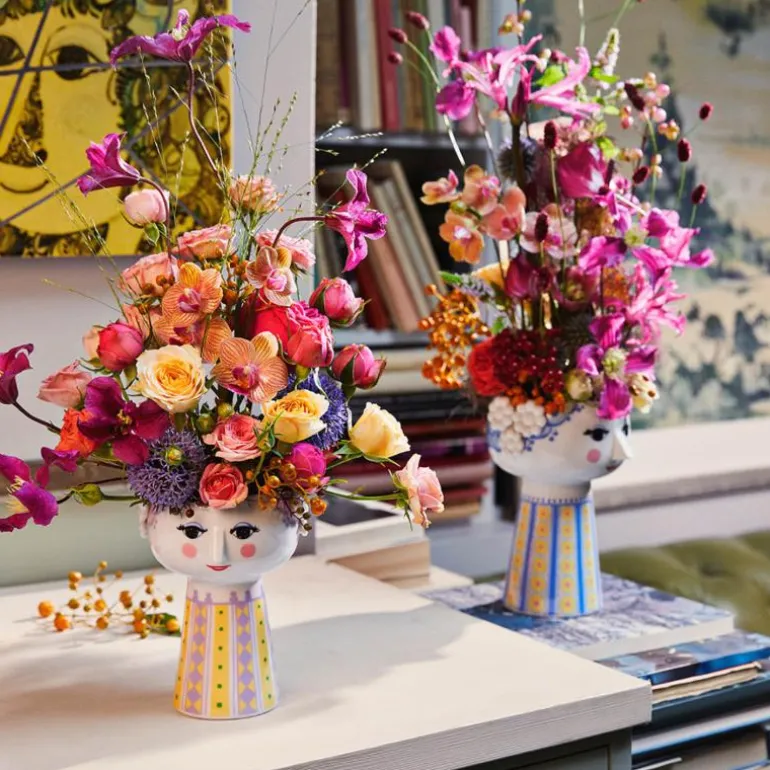 Eva vase fra Bjørn Wiinblad, i fargen lavendel. Bjørn Wiinblad representerer alt som er sprøtt, finurlig, kreativt og vidunderlig. Og med den vakre og smilende Eva-vasen fra Bjørn Wiinblad med hår og kjole i lavendel med gule og grønne nyanser, kan du skape en finurlig og fargerik stemning i hjemmet. Vasen er 15 cm høy med en diameter på 10 cm og laget av blankglasert porselen. Ansiktet med de mandelformede øynene og spiss nese er Wiinblads originale strek, mens det fargerike kjolemønsteret er en nytolkning av Bjørn Wiinblads illustrasjoner fra arkivene. Formen er inspirert av Wiinblads originale og ikoniske Eva-vaser, som hadde brede hoder og kjegleformede kropper.