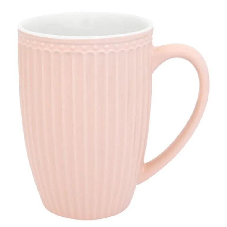 Everyday Alice høyt krus på 40 cl i pale pink fra GreenGate kombinerer tidløs eleganse med praktisk bruk. Den høye formen gir rikelig plass til kaffe, te eller kakao – perfekt for deg som liker store kopper. Krusets enkle, stilrene design gjør det til et naturlig valg for enhver borddekking.