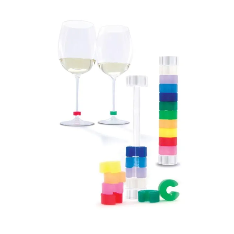 Morsomme og fine fargekoder som festes rundt stetten på vinglasset, slik at alle på festen kan kjenne igjen glasset sitt.