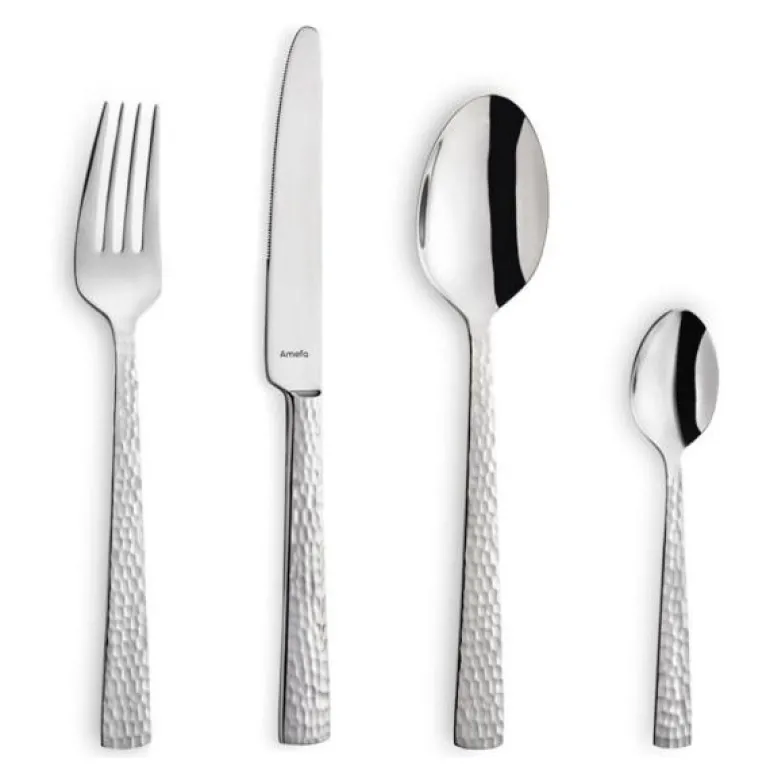 Bestikksett med 24 deler i rustfritt stål fra Amefas prisbelønte Felicity-serie er beregnet for 6 personer. Bestikket er laget av 18/0 rustfritt stål av høyeste kvalitet og hamret håndtak. Bestikket kan vaskes i oppvaskmaskin og kommer i en hyggelig gaveeske.