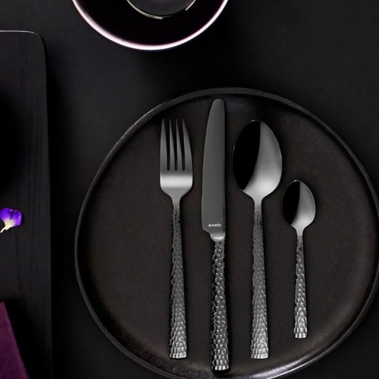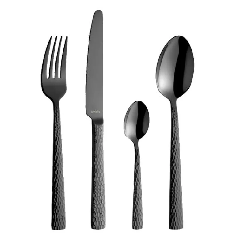 Bestikksett med 24 deler svart fra Amefas prisbelønte Felicity-serie, er beregnet for 6 personer. Bestikket er laget av 18/0 rustfritt stål av høyeste kvalitet og hamret håndtak. Bestikket kan vaskes i oppvaskmaskin og kommer i en hyggelig gaveeske.