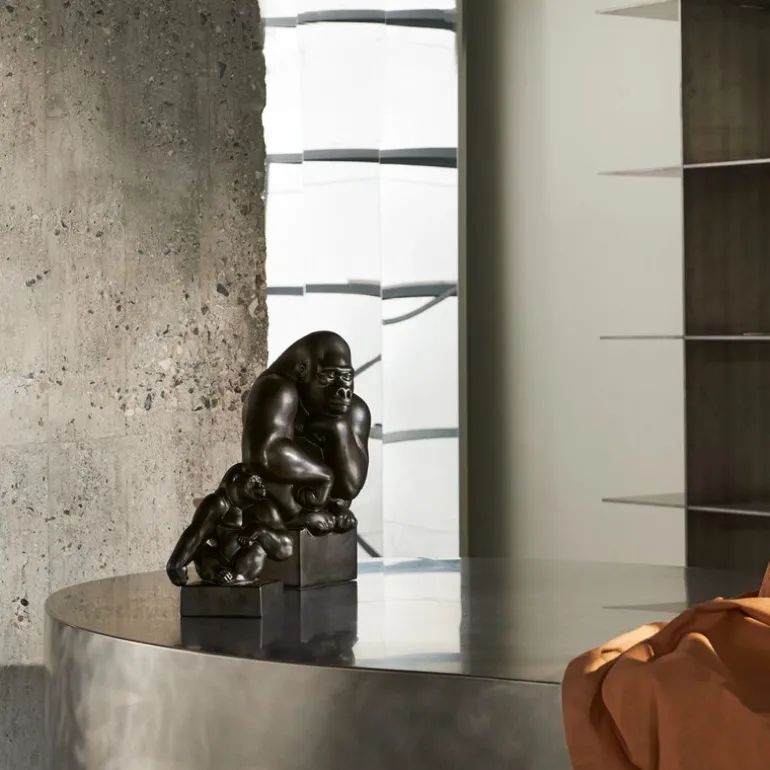 Figur Gorilla 20,5 cm i grafitt fra Royal Copenhagen er et imponerende kunstverk som fanger det majestetiske dyret med enestående detaljer. Skulptør Pia Langelund har en enestående evne til å skildre dyrenes anatomi, og hver muskel og linje i denne gorillaen er nøye utformet for å fremheve dens kraft og skjønnhet. Med en spesiell kjærlighet til aper, og fremfor alt gorillaer, har Langelund skapt en hyllest til dette fascinerende dyret. Den grafittfargede glasuren gir figuren et dypt og sofistikert utseende som gjør den til et tidløst blikkfang i ethvert interiør. Et vakkert kunstverk for dyreelskere og samlere som setter pris på kvalitet og håndverk.
