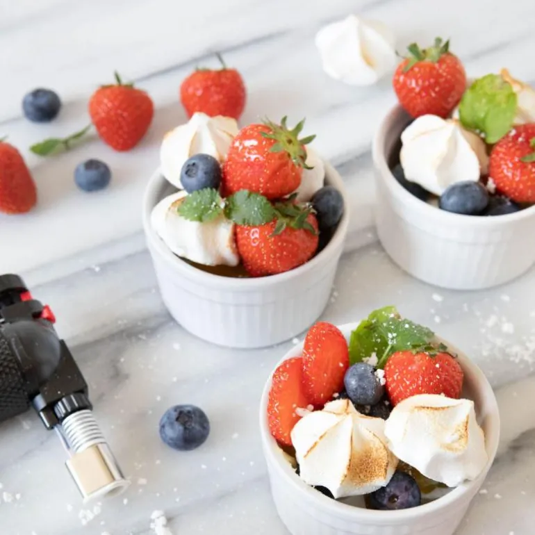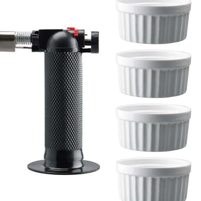 Imponer venner eller familie med en virkelig god crème brûlée. Du kan enkelt forberede denne førsteklasses desserten med vårt crème brûlée-sett Fire, som består av fire hvite souffleboller og en praktisk brenner.