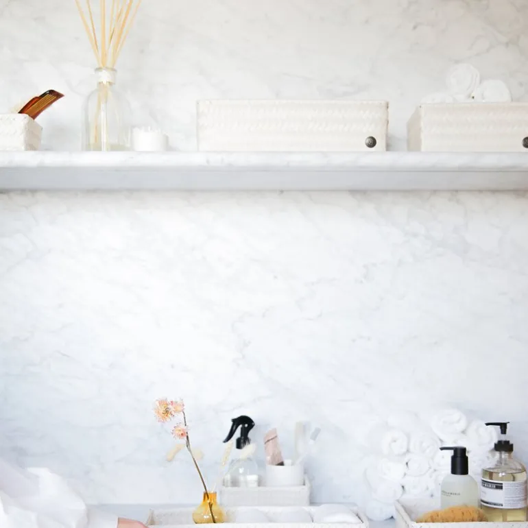 Den håndflettede kurven har et elegant uttrykk med et dekorativt bånd og et vakkert flettemønster. Laget av resirkulert plast, og passer like godt på badet som i kjøkkenet eller kontoret. En stilren og funksjonell måte å organisere hjemmet på.