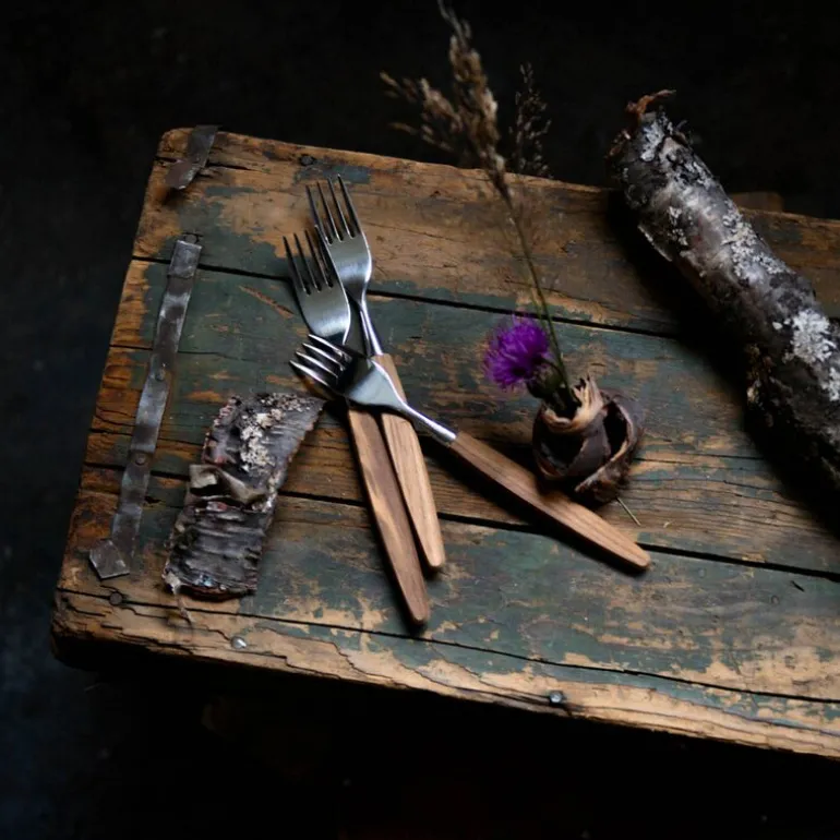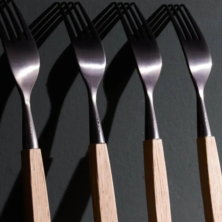 Fjord gaffel 21 cm. Naturen er alltid til stede i vårt design. Når Restaurant Under ba Skaugum om å lage deres bestikk ble Skaugum inspirert av overgangen mellom sjø og land. Drivveden som slipes til kunstverk av tidevann på et nakent svaberg. Resultatet ble FJORD. Norsk Eik, tromlet av naturen, kombinert med mørkt stål som speiler havets farge en høstdag. Vakrere blir det ikke. Settet blir levert i en pen gaveeske. Skaugum Bestikks kronelogo er deres garanti for at du holder et håndlaget, norsk kvalitetsbestikk. Bordknivene er smidde, som gir en skarphet og kvalitet som ingen andre produksjonsmetoder klarer. Bestikket er produsert i rustfritt mørkt stål med 18/8-kvalitet, skaftet er tilvirket av tromlet norsk eik og har en røff overflate. Skaugum Bestikk i Fjord må vaskes for hånd. Skaugum sine bestikk har sett like ut helt siden starten i 1943. Skaugum lager sine bestikk for hånd, som er en spennende og tidkrevende prosess. Stålet varmes opp til 1035 grader før vi slår med en hydraulisk hammer ned i ønsket form. Våre plastskaft blir støpt mens treskaftene sages og freses. Vi skjefter, polerer, og borer hver del for hånd på maskiner fra en annen tidsalder.