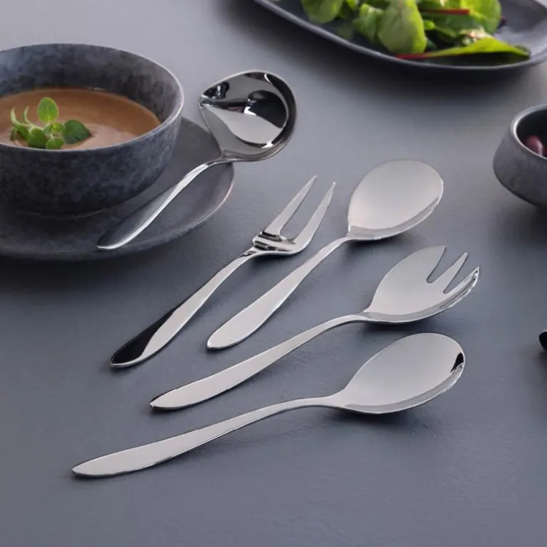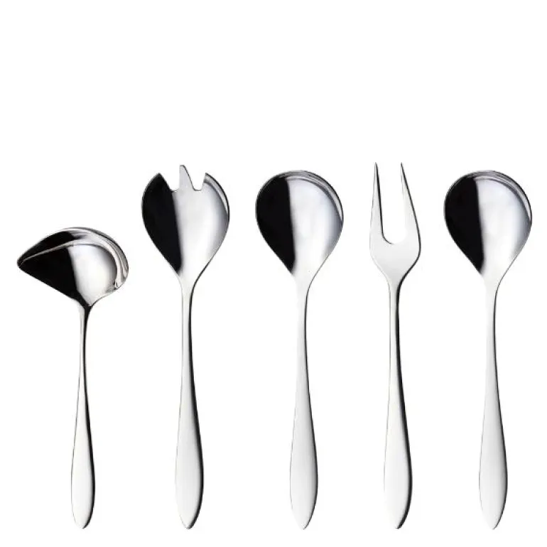 Serveringssett 5 deler fra den myke og minimalistiske Fjord-serien fra Hardanger Bestikk. Bestikket har rene, elegante linjer som er typisk for den skandinaviske minimalismen. Serveringsskjeene, serveringsgaffelen og salatgaffelen har gripevennlig håndtak og presise egenskaper. Sausøsen har liten størrelse og spiss helletut for å dandere presist. Stålet som er av 18/10 rustfritt stål tåler oppvaskmaskin, og produktet har livstidsgaranti. Serveringsdelene leveres i gaveeske og inneholder;