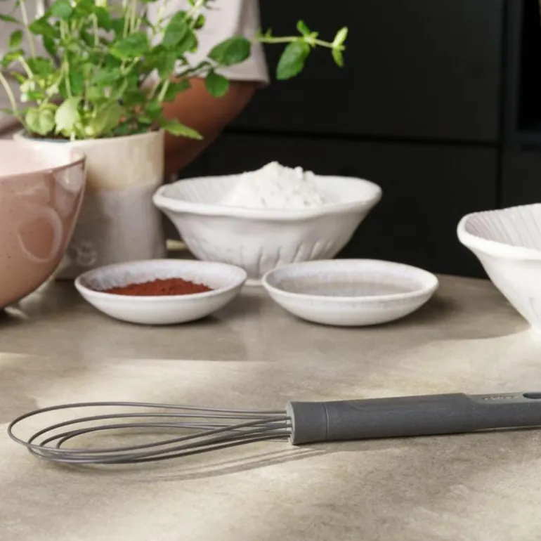 Grå flatvisp med silikon 30 cm fra Zyliss. Flatvispen er spesielt egnet for å vispe væsker i grunne panner. Den har et trådhode med silikonbelegg. Dette betyr at den kan brukes sammen i non-stick kokekar.