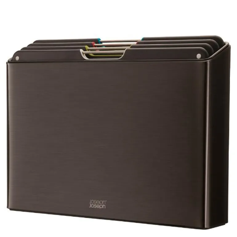Joseph Joseph sine fargekodede Folio Steel skjærebrett gjør det enkelt å holde både matlagingen og kjøkkenbenken organisert. Dette smarte settet har 4 skjærebrett i ulike farger, samlet i en moderne beholder i rustfritt stål.