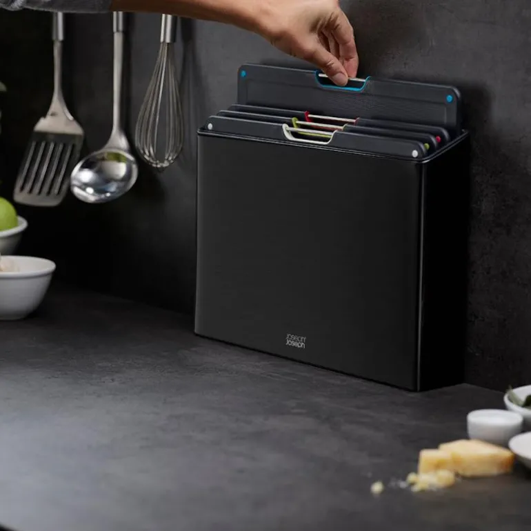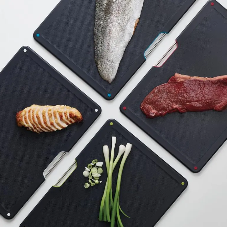 Siden Joseph Joseph ble etablert i 2003, har de lansert mer enn 1000 produkter som gjør livet på kjøkkenet enklere. Dette fargekodede skjærebrettsettet er ett av dem – et produkt av høy kvalitet som hjelper deg å holde matlagingen både trygg og hygienisk.