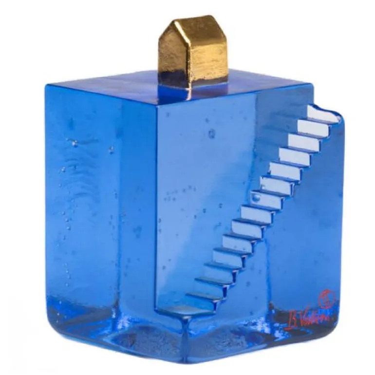 Fortress Stairs BV AC-23 i fargen blå/gull fra Kosta Boda. Arkitekter og barn bruker å være besatt av trapper. Bertil deler den kjærligheten. I over fire tiårhar han skapt og utforsket glasskulpturer der trappen er selve livsnerven, glassets bærende element. En kube, et lite hus, en trapp, av disse tre enkle former (og et par farger) skaper Bertil Vallien en anekdote som setter noe i bevegelse, ikke bare lysten til å springe opp og ned i trapper.