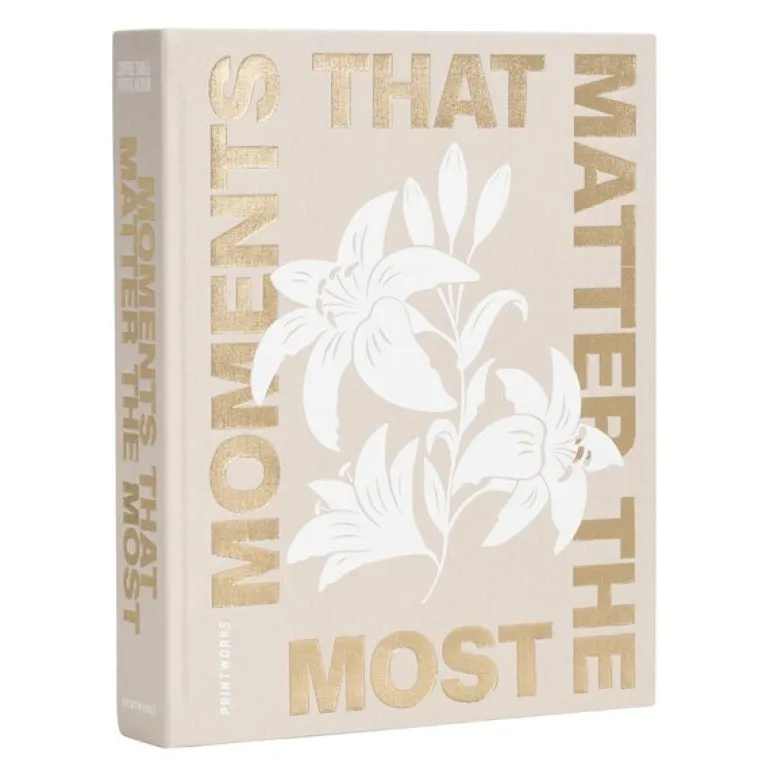 Fotoalbum Moments That Matter the Most i beige fra Printworks gir en eksklusiv ramme til dine kjæreste minner. Det beige tøyomslaget med gullfoliert tekst gir albumet et luksuriøst preg, perfekt som et stilig innslag på salongbordet.