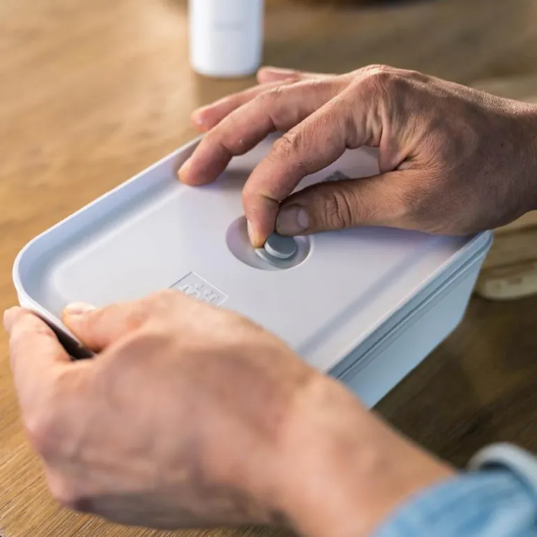 Bruk vakuumboksene ved å fylle dem med ønsket mat, lukk lokket, plasser Zwillings Fresh & Save-pumpen (kjøpes separat: art.nr. 1002498) på ventilen og trykk på dyseknappen for å suge ut luften. Dette tar bare sekunder og du får mat som smaker nylaget selv etter flere dager.