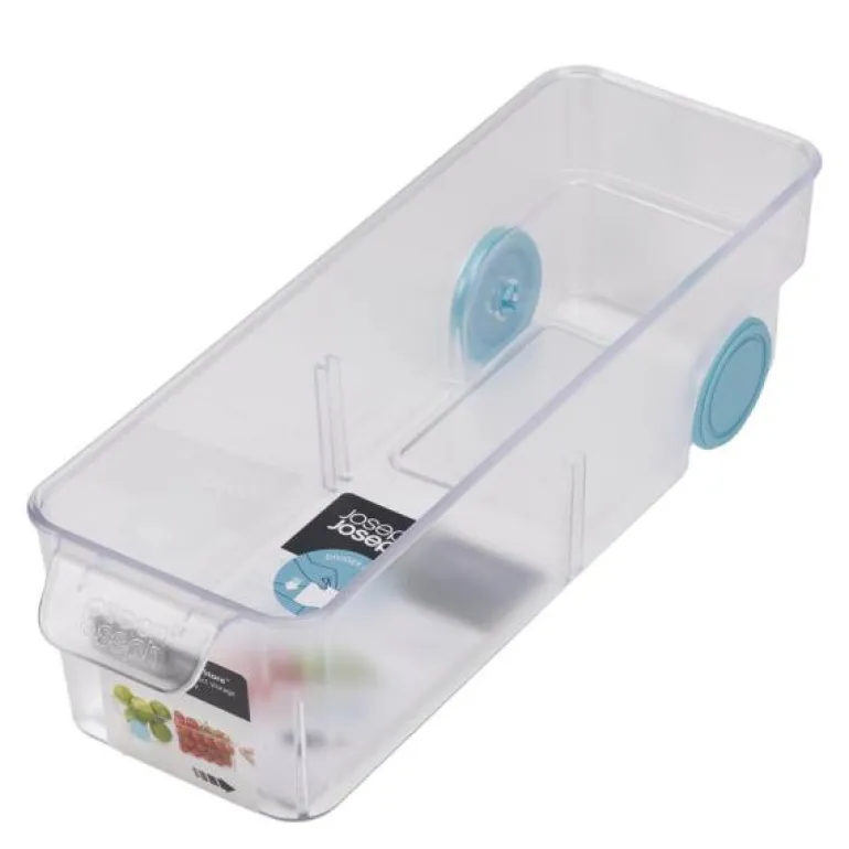 Joseph Josephs FridgeStore oppbevaringsboks, med målene 30,8 x 10,4 x 8,5 cm, er designet for å skape ekstra organisert plass i kjøleskapet ditt. Den smarte designen har et håndtak som er enkelt å trekke, og jevnt løpende hjul som gjør tilgangen til matvarene enkel og problemfri. Boksen har også en avtakbar skillevegg som gir mulighet for organisert oppbevaring av forskjellige matvarer.