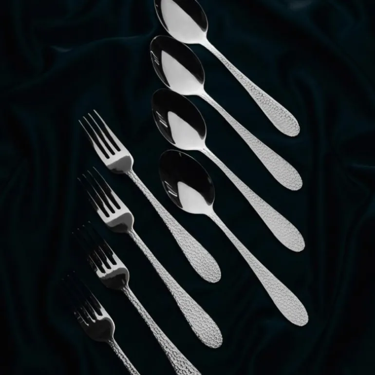 Frost dessertbestikk i stål fra Vargen & Thor er et elegant sett som gir et løft til enhver dessertservering. Bestikket er laget i rustfritt, polert 18/10-stål med et hamret mønster på begge sider, og den klassiske stålfinishen gir en tidløs og stilren uttrykk. Settet inneholder 8 deler og er designet for både formelle og uformelle anledninger.