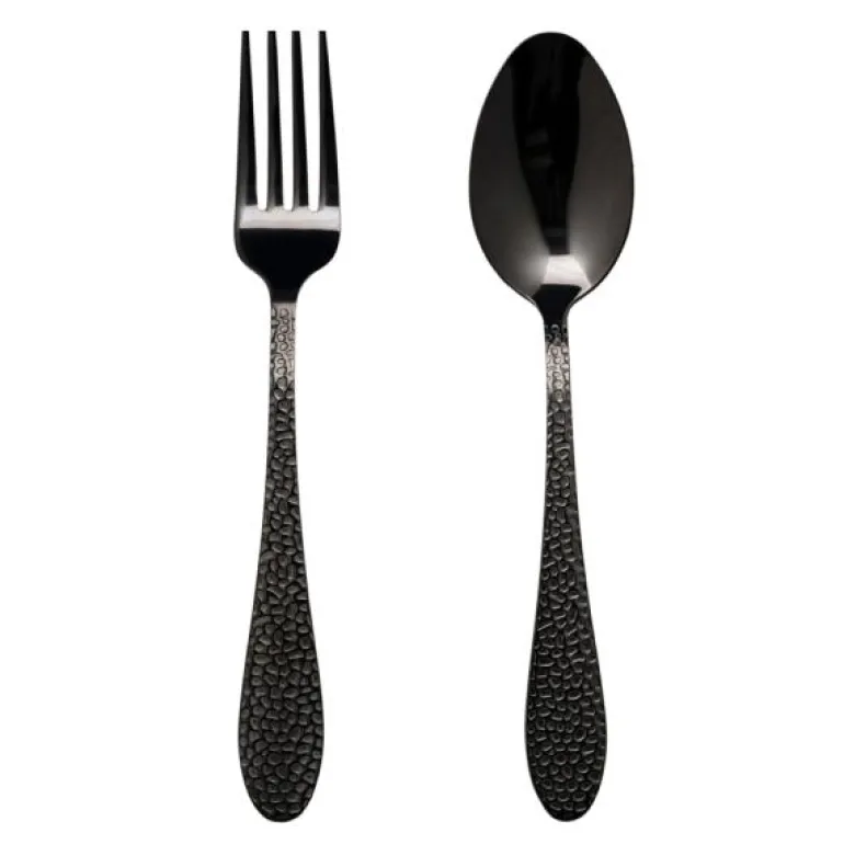 Frost dessertbestikk svart, i 8 deler, fra Vargen & Thor kombinerer moderne eleganse med funksjonell design. Settet inneholder åtte deler i svart, laget av rustfritt stål av typen 18/10 med et hamret mønster på begge sider. Den sorte finishen gir et stilrent og iøynefallende uttrykk som løfter dessertserveringen, enten det er til hverdags eller fest.