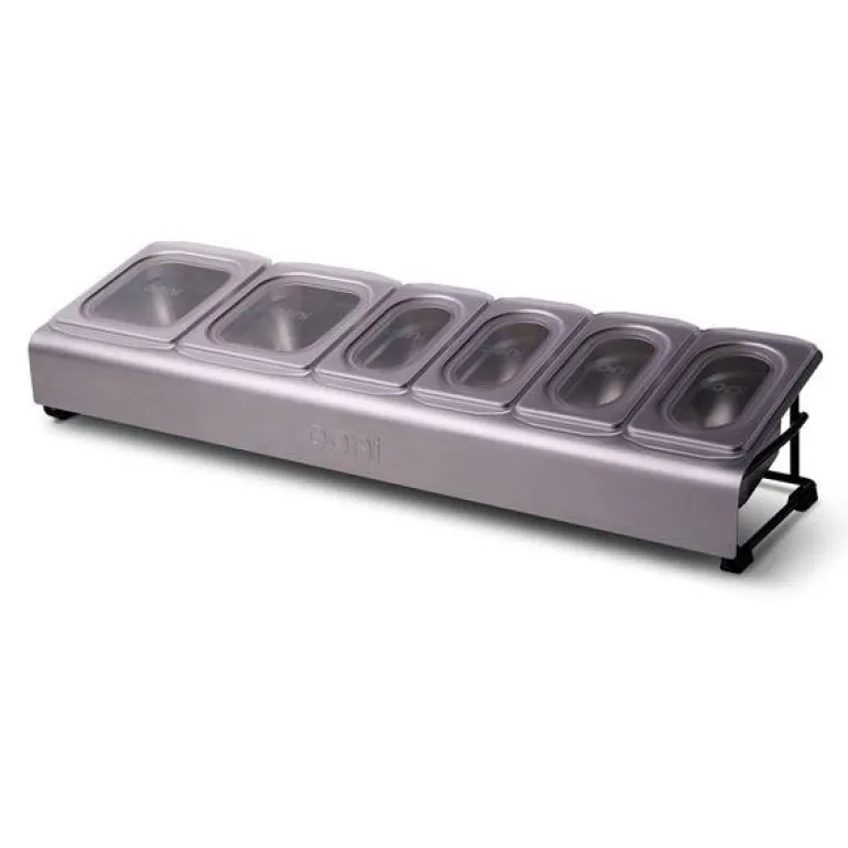Ooni Pizza Topping garnityrstativ gjør det enkelt å forberede ingredienser til pizzalaging, både inne og ute. Systemet er laget for å være lett å transportere og gir deg full oversikt over pålegg og tilbehør når du lager mat. Med to beholdere på 1,6 liter og fire på 0,8 liter har du god plass til alle ingrediensene du trenger.
