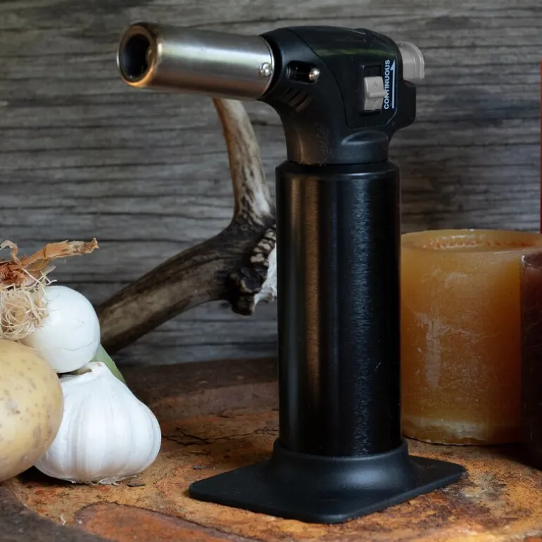 En brenner kan brukes til mye mer enn bare å karamellisere Crème Brûlée. Den kan brukes både som en tilberedningsmetode og for å tilføre smak. Raskt brenn grønnsaker, kjøtt og fisk for å få frem en naturlig grillet og brunet smak. Brenneren har en brennetid på cirka 45 minutter per påfylling.