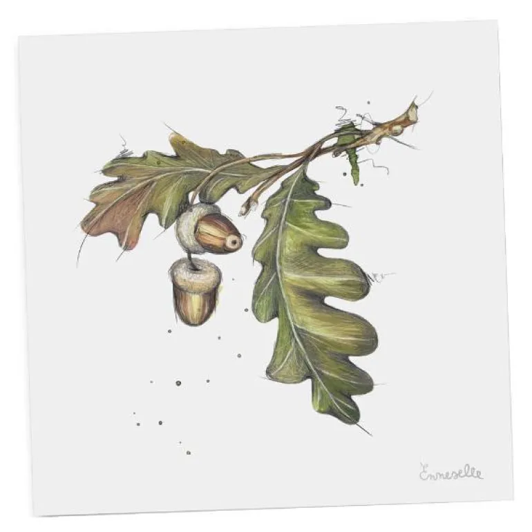Fin gavelapp fra Emmeselle med motiv av eikenøtter. Motivet er etter tegninger fra kunstner og illustratør Mona Stenseth Erlandesn.