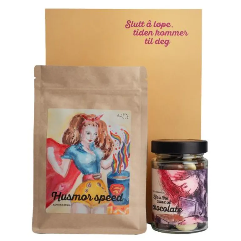 Cellofanpose bestående av Husmorspeed og Life is like a b ox of chocolate. Premium kaffe fra Nyeri distriktet i Kenya – jøpt direkte fra produsentland og fra kooperativ. Bruk din makt som forbruker til å skape en bedre og mer rettferdig verden. Når du betaler det kaffen egentlig koster, vil plantasjearbeiderne og barna deres få skolegang og et verdig liv. Velg med hjertet. Life is like a box of chocolate er virkelig en favoritt i godteskåla!