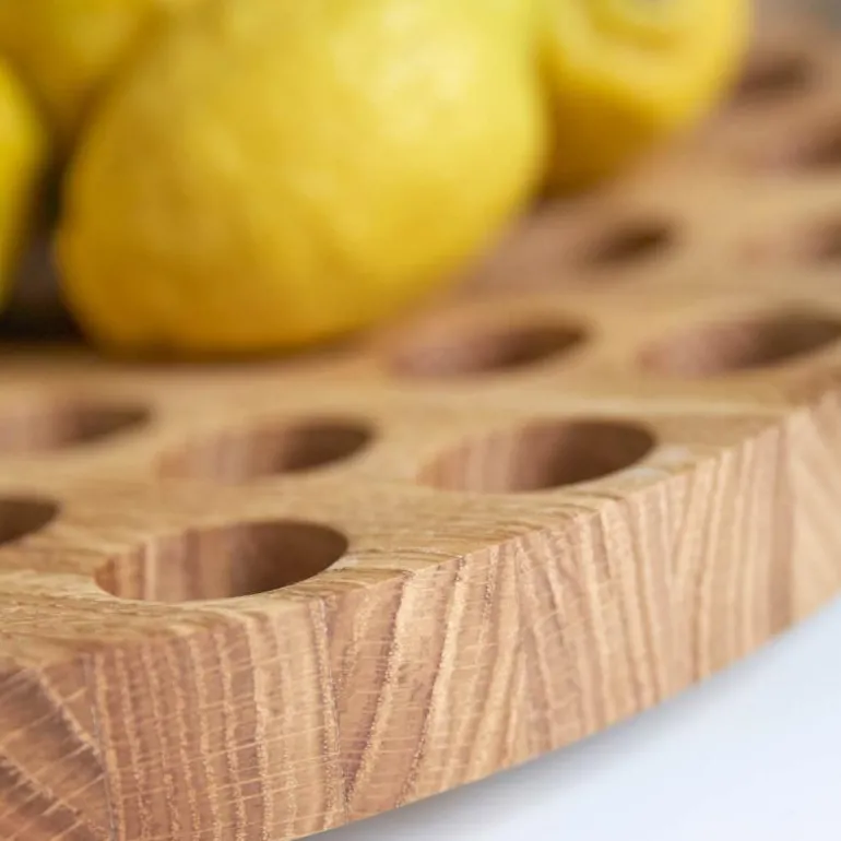 Dekorativ fruktskål, Geo 360 i eik fra Wireworks. Den forsiktig avrundede bunnen løfter kantene på bollen, lyser opp utseendet og gjør det mulig å dreie bollen rundt. Det tilfeldige mønsteret av hull etablerer en dynamikk for å begeistre øyet. Luftsirkulasjonen fremmes av den åpne strukturen, og holder frukten friskere lenger.