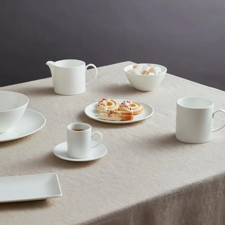 Gio Espresso Cup & Saucer BXd. Gio er en moderne kolleksjon med et preget design inspirert av Wedgwoods håndlagde intaglio-teknikker. Lag av keramikk er skåret gjennom for å få frem en tekstur og en taktil overflate på hver del, mens det tidløse, hvite benporselenet skaper en vakker gjennomskinnelighet. Gio er en perfekt frittstående serie i hjemmet, men kan kombineres med andre kolleksjoner som Gio Gold for et mer sofistikert uttrykk. Kolleksjonen tåler både oppvaskmaskin og mikrobølgeovn, og er designet for å brukes hver dag.