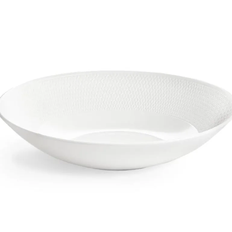 WWGio Pasta Bowl 23.1/ 9.1in. Gio er en moderne kolleksjon med et preget design inspirert av Wedgwoods håndlagde intaglio-teknikker. Lag av keramikk er skåret gjennom for å få frem en tekstur og en taktil overflate på hver del, mens det tidløse, hvite benporselenet skaper en vakker gjennomskinnelighet. Gio er en perfekt frittstående serie i hjemmet, men kan kombineres med andre kolleksjoner som Gio Gold for et mer sofistikert uttrykk. Kolleksjonen tåler både oppvaskmaskin og mikrobølgeovn, og er designet for å brukes hver dag.