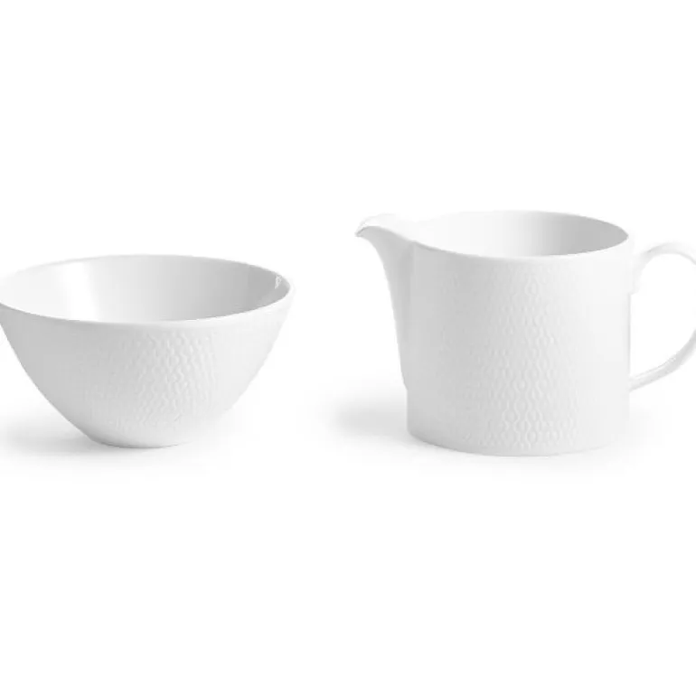 Gio Sugar & Cream BXD. Gio er en moderne kolleksjon med et preget design inspirert av Wedgwoods håndlagde intaglio-teknikker. Lag av keramikk er skåret gjennom for å få frem en tekstur og en taktil overflate på hver del, mens det tidløse, hvite benporselenet skaper en vakker gjennomskinnelighet. Gio er en perfekt frittstående serie i hjemmet, men kan kombineres med andre kolleksjoner som Gio Gold for et mer sofistikert uttrykk. Kolleksjonen tåler både oppvaskmaskin og mikrobølgeovn, og er designet for å brukes hver dag.