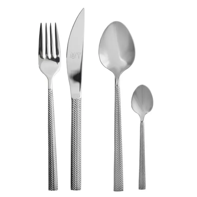 Bestikksettet, som består av gaffel, kniv, skje og teskje for fire personer, er laget av høykvalitets rustfritt stål. Dette sikrer en solid og slitesterk konstruksjon som tåler daglig bruk uten å miste sin glans. I tillegg gjør materialets motstandskraft mot korrosjon det til et praktisk og varig valg for ethvert kjøkken. Ergonomien er nøye gjennomtenkt, slik at hvert stykke ligger behagelig i hånden, og gjør måltidene enda mer komfortable.