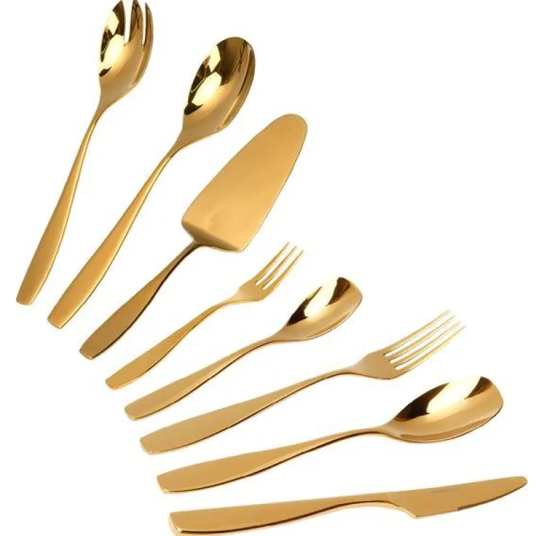 Bestikksett som dekker både til forrett, middag og dessert! MODERN HOUSE design Golden Rose er et gullfarget bestikk, produsert i 18/8 (knivblad 13/0) stålkvalitet som er motstandsdyktig mot flekker og korrosjon, men selv de fineste legeringer vil svekkes om det utsettes for eksempelvis etsende/syreholdig mat, salt, høyt mineralinnhold i vann, sterke vaske/blekemidler. Stål 18/8 betyr at det består av 18% krom og 8% nikkel. Bestikket kan rengjøres i oppvaskmaskin på skånsomt program (45°C). 6 kniv 6 gaffel 6 skje 6 teskje 6 kakegaffel 1 kakespade 1 salatbestikk Vær oppmerksom på følgende for å forlenge levetiden på bestikket: 1. Skyll salt eller mat fra bestikk rett etter bruk. Dette for å unngå rust og andre flekker som kan oppstå, spesielt av mat med høyt syreinnhold. 2. Oppvaskmaskin – Fjern matrester før bestikket settes inn i oppvaskmaskin. Velg et skånsomt program og bruk liten mengde rengøringsmiddel. Ta ut bestikket fra oppvaskmaskinen umiddelbart etter tørking. Tørk av fuktighet, før bestikket legges bort. Dette for å unngå rust og andre flekker som kan oppstå. 3. Håndvask, – bruk varmt vann tilsatt flytende vaskemiddel og skyll grundig. Vannmykner kan være nødvendig dersom høyt mineralinnhold i vannet. Tørk umiddelbart etter vask med en myk klut. 4. Såpe med skuremiddel eller oppvaskskrubb skal ikke benyttes, da det vil gi skraper i belegget. 5. Messing og kobber polering må ikke benyttes på bestikket!