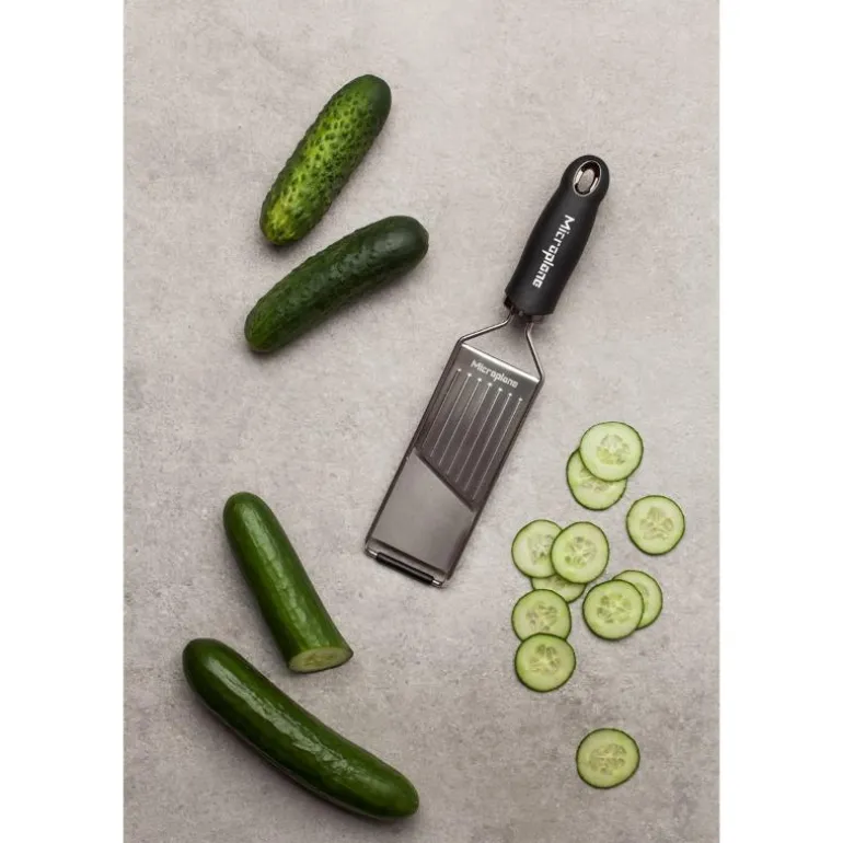 Mandolinjern i rustfrit stål med slicer skjær fra Microplanes Gourmet serie. Rivejernet har et skjær på 2 mm, som gir ensartet skiver.