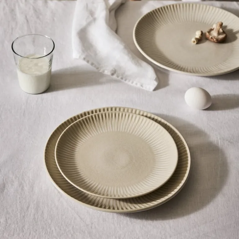 Granada tallerken fra Tell Me More har en diameter på 22 cm og er laget i håndlaget steintøy. Den reaktive glasuren i kremfarge utvikler sine nyanser under brenningen, noe som gir hvert eksemplar unike fargetoner og subtile variasjoner i overflaten.