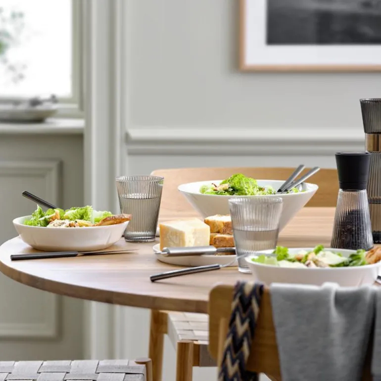 Både størrelsen og den enkle designen gjør skålen anvendelig. Bruk den til elegant servering av salat og mat eller som praktisk verktøy i matlagingen.