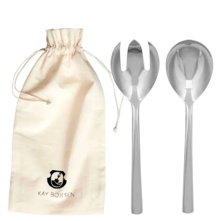Salatbestikk i 2 deler, Grand Prix fra Kay Bojesen består av en serveringsskje og en gaffel som sikrer et godt grep om grønnsaker og salater. De er også gode for å få ting ut av kokende vann på komfyren. Det store salatsettet består av en salatskje (23,5 cm) og en salatgaffel (23,5 cm). Leveres i Kay Bojesen gavepose i 100% bomull.