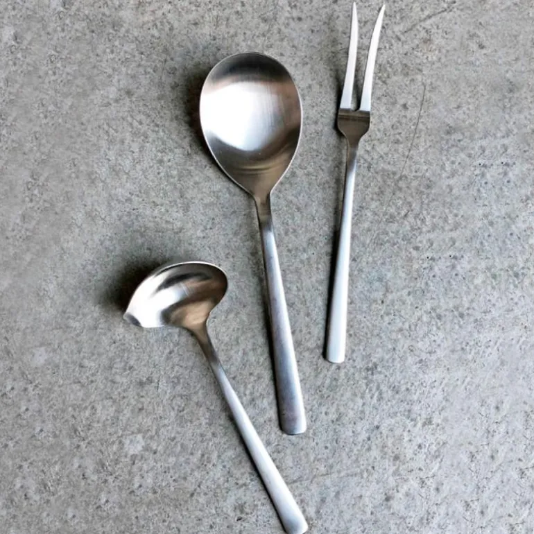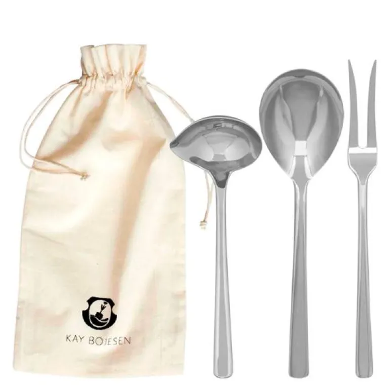 Serveringssettet består av en stekegaffel (22,5 cm), en serveringsskje (23,5 cm) og en sausskje (18,5 cm). Leveres i Kay Bojesen gavepose i 100% bomull.