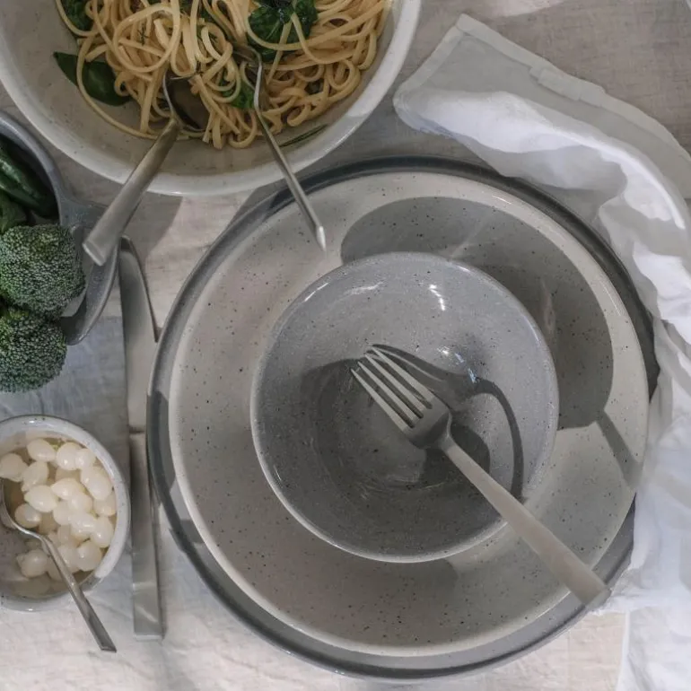 Nydelig servise i rustikt preg i glasert grå med spettete partikler . Produsert i Portugal som er kjent for sin høye ekspertise på kvalitet til det dekkede bordet. Produksjonsmetoden gir et unikt utseende og variasjon i formen som gir et røffere preg som skiller seg ut. Serviset tåler microbølgeovn og kan rengjøres i oppvaskmaskin. Vis omsorg for den unike kanten ved håndtering etter oppvaskmaskin.