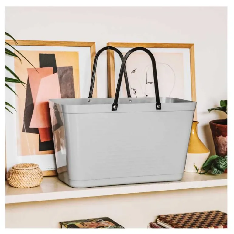 Hinza-vesken av grønn plast med et volum på 15 liter kombinerer praktisk funksjonalitet med et sjarmerende 50-tallsdesign som gjør den både stilig og allsidig. Produsert i Sverige av biobasert plast fra sukkerrør, er den et slitesterkt og pålitelig valg for både hjemmebruk og utendørsaktiviteter. Vesken er ideell for oppbevaring av strikkeutstyr, leker, vedkubber ved ovnen eller som en følgesvenn i hagen, på soppturer, reiser og sosiale anledninger.