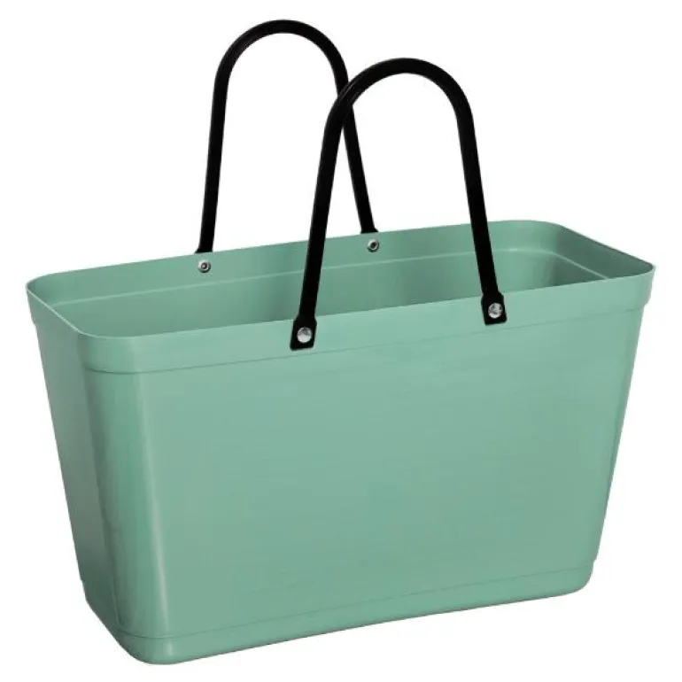 Green Plastic veske stor 15L i olivengrønn fra Hinza er både funksjonell og stilfull, med et tidløst design inspirert av 50-tallet. Denne vesken er laget i Sverige av biobasert plast fra fornybare sukkerrør, noe som gjør den til et bærekraftig valg for den miljøbevisste forbruker.