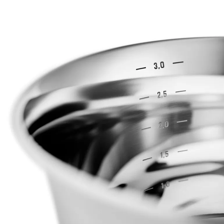 Det rustfrie stålet reagerer ikke med sure eller basiske ingredienser, noe som gjør bollen ideell for oppbevaring av mat uten risiko for påvirkning av smak eller kvalitet. Innvendige målemarkeringer forenkler oppmåling direkte i bollen, og den kan stables for å spare plass. Enkel rengjøring er sikret ved at bollen tåler oppvaskmaskin.