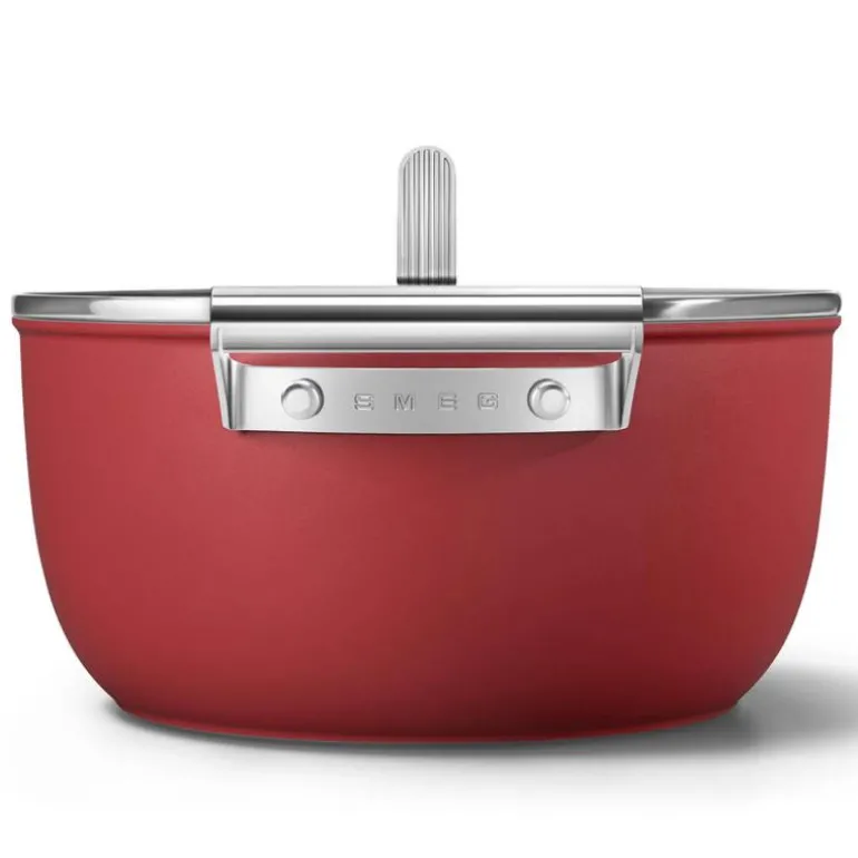 Elegant gryte med lokk 4,8L i rød fra Smeg, med en diameter på 24 cm, kombinerer en aluminiumskropp og rustfri stålbunn for optimal holdbarhet og jevn varmefordeling. Med en bunn og kant på 4,5 mm sørger gryten for stabil varme, ideell for allsidig matlaging.