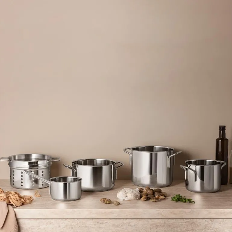 Eva Trio grytesett består av 5 deler i rustfritt stål og kan brukes på alle koketopper, inkludert induksjonstopp. Grytesettet tåler også oppvaskmaskin, som gjør rengjøringen enkel og praktisk.