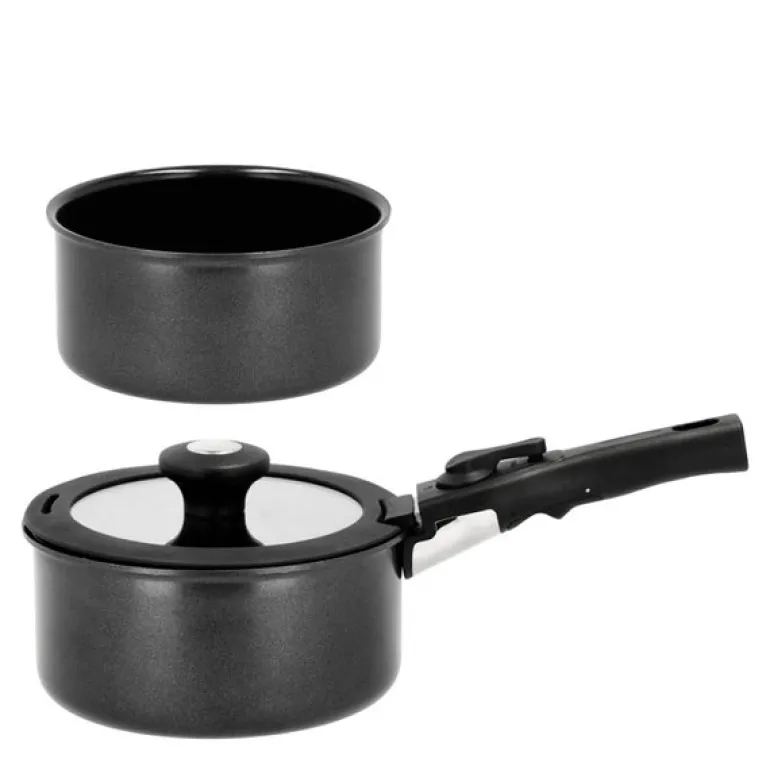 Holm grytesett med avtakbart håndtak er en praktisk og allsidig løsning for både hjemmekjøkkenet og matlaging på farten. Settet inkluderer en 1,1 liters kasserolle, en 2,4 liters gryte med glasslokk, og et avtakbart håndtak som kan brukes på begge grytene.