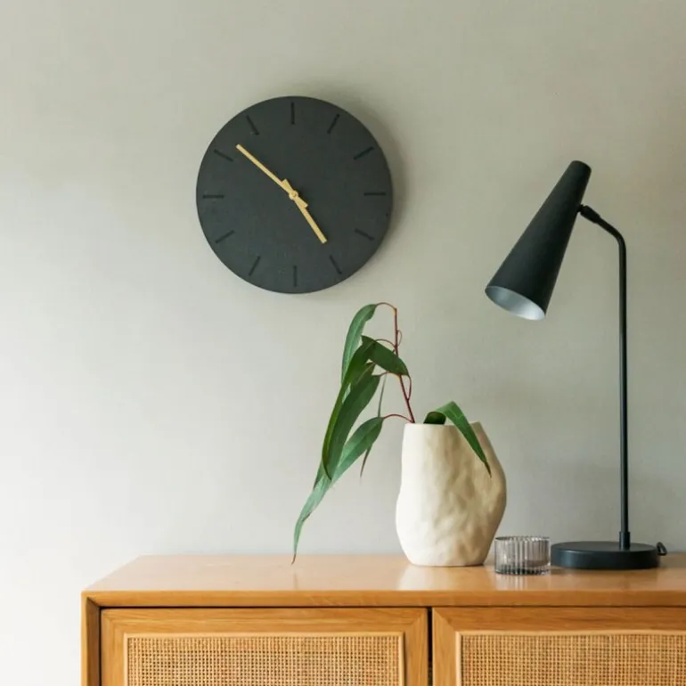 Hemverks Gunpowder veggklokke i mørk grå MDF er et uttrykksfullt og tidløst valg. Med en glatt, matt overflate og melert fargespill, kombinerer klokken et minimalistisk design med en rå estetikk. Gullviserne gir en luksuriøs kontrast til det mørke, gjennomfargede treverket, og tilfører en myk varme til det ellers stramme uttrykket. Denne klokken er perfekt for moderne nordiske interiører og kan tilpasses etter stil og preferanse. Velg visere for å skape enten et helsvart eller varmt uttrykk som gir veggen en personlig og elegant detalj.