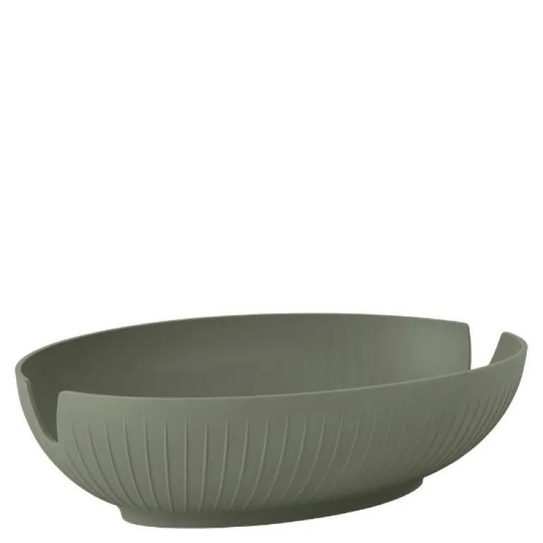 Den elegante brødkurven fra Kählers Hammershøi-serie er fremstilt i olivengrønn biobasert plast og har samme matte overflate som den grønne termokannen i serien. Den har en funksjonell sliss som kan brukes til å holde brødkniven på plass, slik at du alltid har den like ved bollene eller rundstykkene når de skal skjæres. Den medfølgende hvite stoffservietten presenterer brødet appetittlig og delikat, og de karakteristiske rillene på yttersiden matcher flott med resten Hammershøi-serviset på bordet. Brødkurven er skapt av Hans-Christian Bauer, som har designet hele Kählers ikoniske Hammershøi-serie med stor respekt for Kählers kunstneriske kulturarv, designhistorie og håndverkstradisjoner.