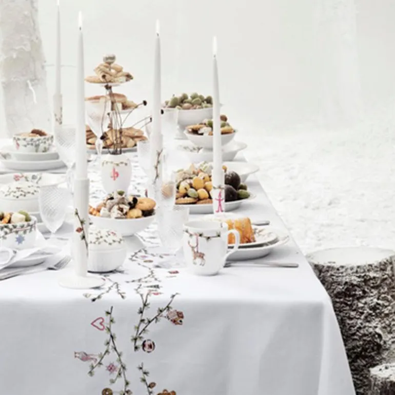 Kählers klassiske hvite Hammershøi-servise har fått en fin juleduk. Duken er dekorert med nostalgiske jule-elementer som nøtteknekkere, trommer, snømenn og julehjerter, mens den grønne lerkegrenen skaper en kontinuitet i designet. Hammershøi Juleduk ønsker julen velkommen med en samling av de kjente illustrasjoner fra det populære juleserviset. De fine, detaljererte julemotivene er tegnet av kunstneren Rikke Jacobsen, som med sin karakteristiske strek forteller små historier med bl.a. kremmerhus, engler, valnøtter, fugler, kongler og stjerner.
