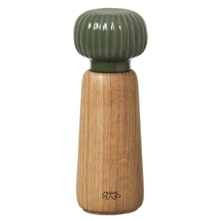 Kähler-kvernen H 18,5 cm fra Hammershøi-serien er utsmykket med en porselenstopp med de kjente, dekorative rillene, som går igjen igjennom hele Hammershøi-serien. Rillene gir ikke bare kvernen en gjennkjennelse – men lar samtidig glasuren fordele seg lett transparent over keramikkens overflate og gjør samtidig kvernen enkel og funksjonell å bruke. Kvernene er fremstilt i porselen og eik. Med Hammershøi kvernen fra Kähler får du elegant skandinavisk design på bordet. Du kan bruke kvernen til salt eller pepper. Kombinér med en annen kvern i hvitt porselen, så du kan se forskjell på din salt- og pepperkvern. man fyller i salt eller pepper ved å løfte forsiktig opp toppen.