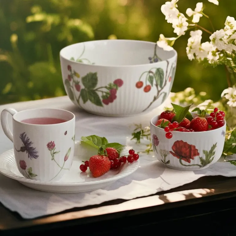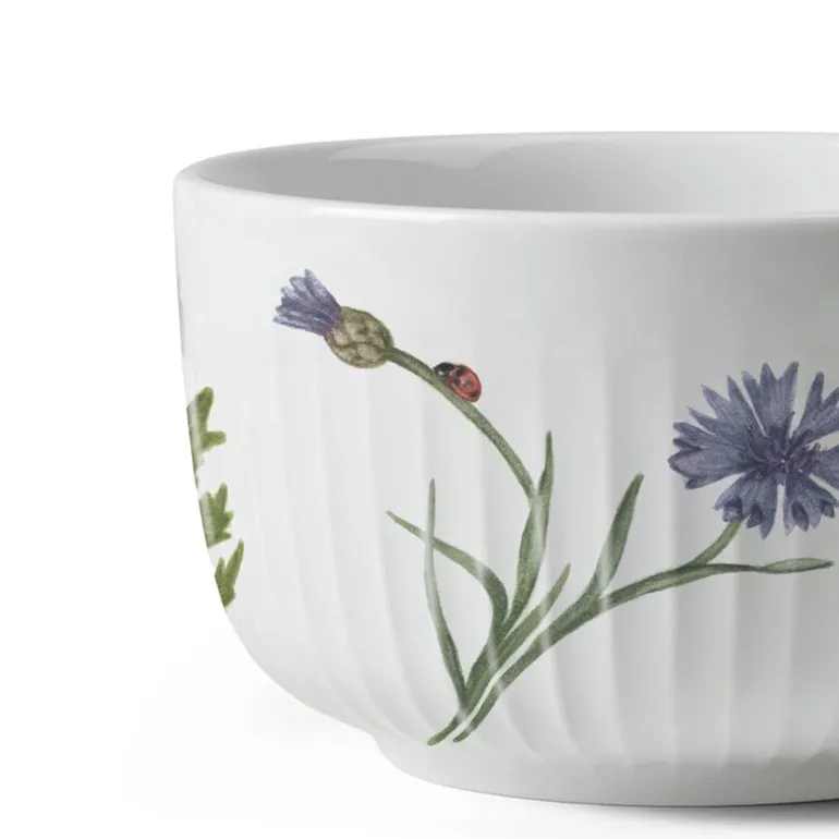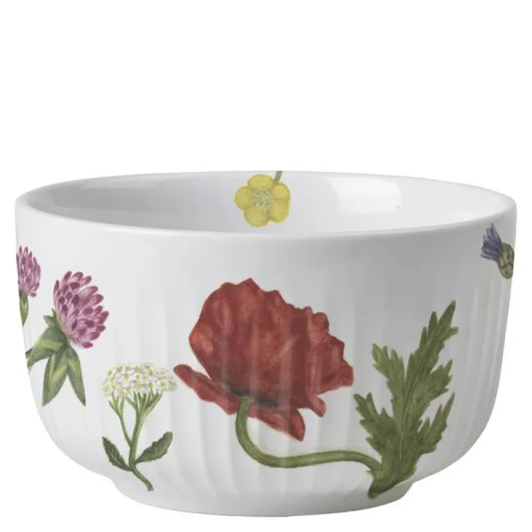 Engblomstene, som pryder skålen, er malt på en måte som gir inntrykk av at de danser og spirer over de klassiske Hammershøi-rillene i den hvite keramikkens glatte overflate. Dette designet, inspirert av sommerens kortvarige magi, forener Hammershøi-seriens tidløse estetikk med naturens spontane skjønnhet. Motivene fanger stemningen av et blomstrende teppe på engen.