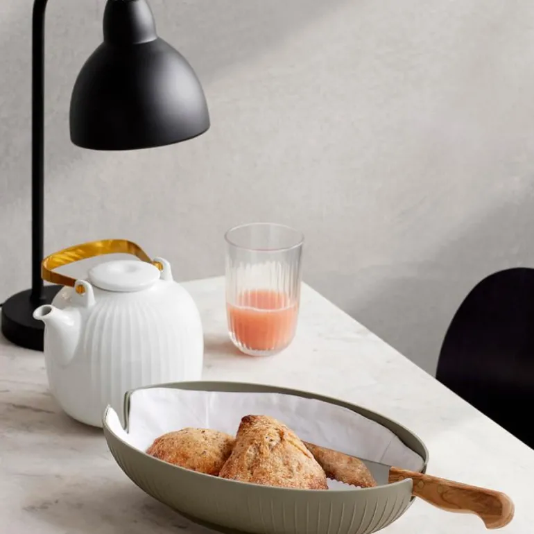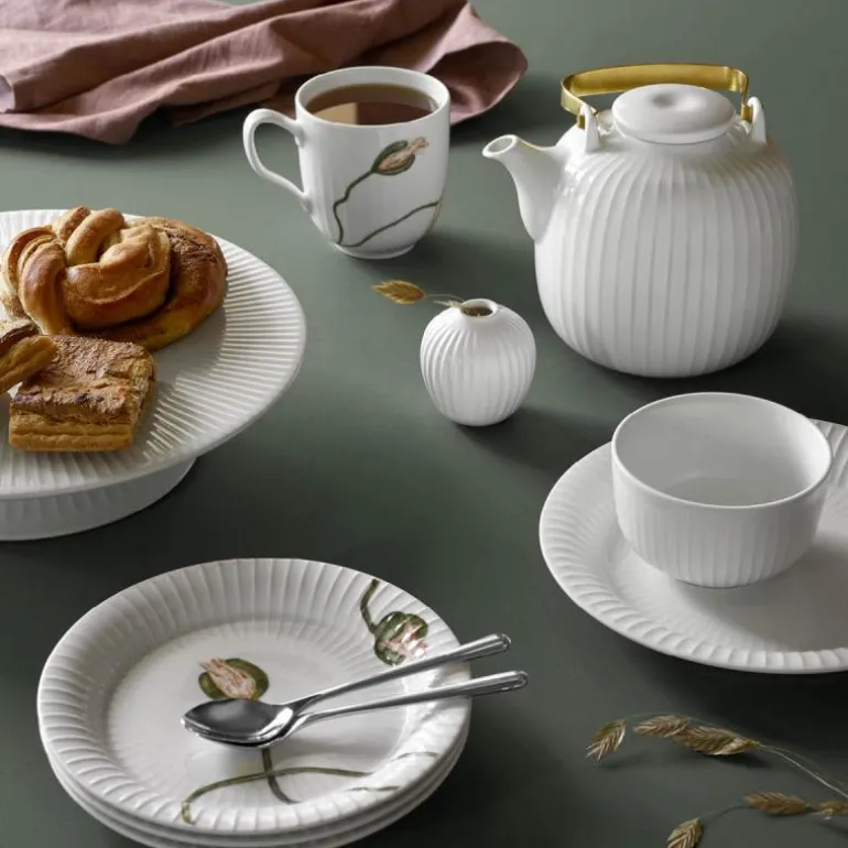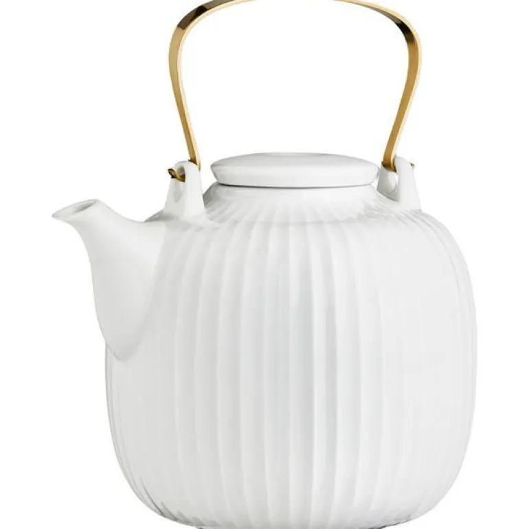 Den hvite tekannen fra Hammershøi-serien er formet i porselen, og innbyr til hjemlig, luksuriøs hygge og samvær rundt en velbrygget kopp te. Tekannen har et elegant, moderne formspråk med en dekorativ messingbelagt hank og en praktisk innebygd sil som lett skiller tebladene fra teen hvis du brygger teen på tradisjonelt vis. Vær oppmerksom på at hanken på tekannen kan bli veldig varm.