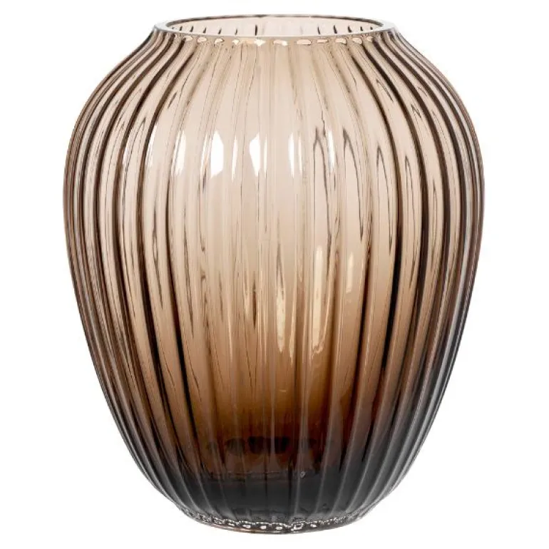 Kähler Hammershøi-seriens glassvaser har den karakteristiske profileringen og tydelige rillene fra Hammershøis keramikkvaser. Glassvasen har en vakker silhuett, men likevel en tyngde og stabilitet. Den kommer nå i en vakker og varm valnøttfarge, hvor dybden av den brune fargen harmoniserer med de andre Hammershøi-seriene på en vakker måte.