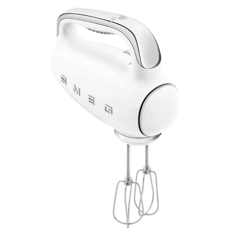 SMEG håndmikser (HMF01) er en elegant kjøkkenassistent i 50-tallsdesign. Med sitt hvite retrodesign er den like stilfull som den er funksjonell.