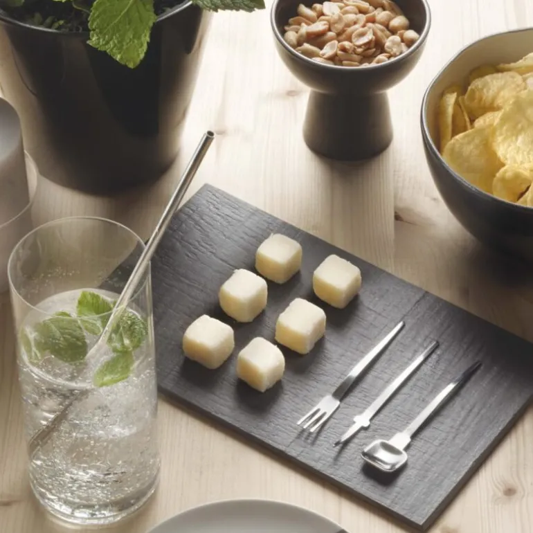 Dette settet med 40 små gafler fra Pintinox Happy Hour-serien er utformet for servering av snacks, tapas og småretter. Hver gaffel er 10 cm lang og laget i tynn rustfri stålplate som gir lav vekt og god funksjon.